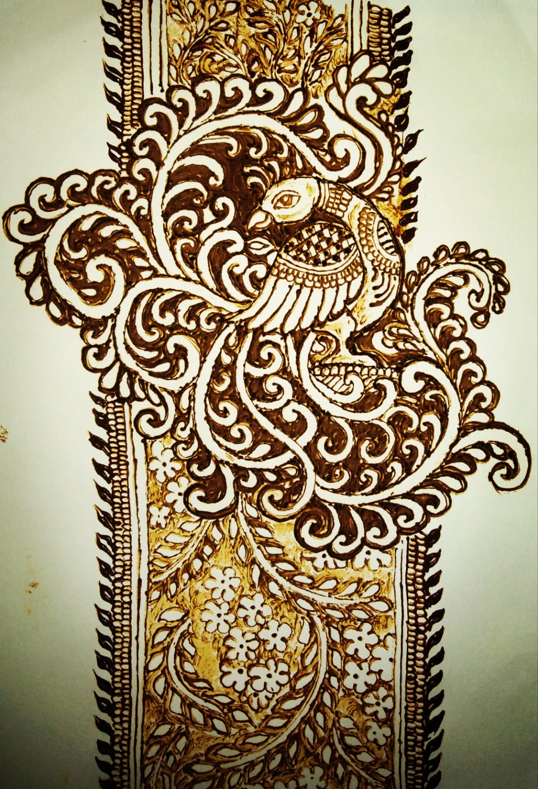 A detailed Kalamkari-inspired peacock henna design symbolizing beauty, grace, and prosperity.